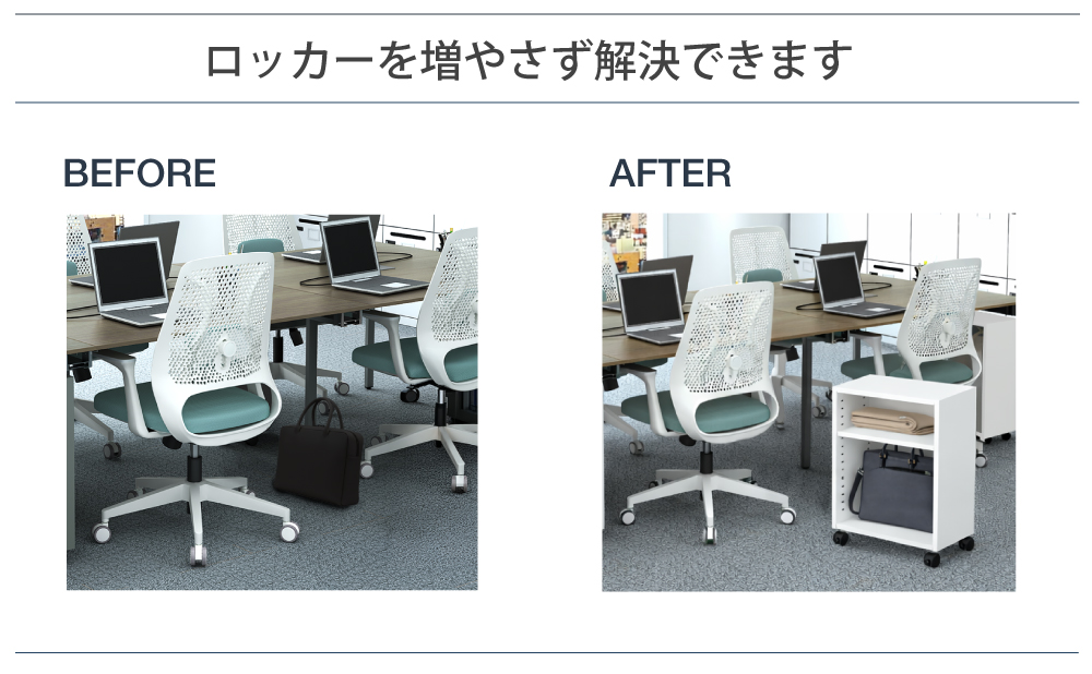 荷物の管理を明確化し足元の乱雑さを解消。デスク下収納の活用で動線を妨げず、フリーアドレス環境でも整った執務空間を維持できます。限られたスペースを有効活用しながら、ワーカーが快適に過ごせる美しいオフィス環境の構築をサポートします。